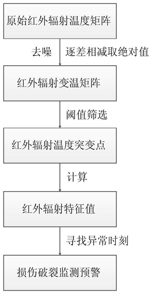 1.承载煤岩破裂的红外辐射监测预警方法,其特征在于,包括如下步骤:步骤1,采集承载煤岩损伤破裂过程中的红外辐射信息以及参照煤岩的红外辐射信息,并对红外辐射信息进行中值和高斯滤波处理,去除噪声干扰,得到参照煤岩和承载煤岩各自对应的原始红外辐射温度矩阵;