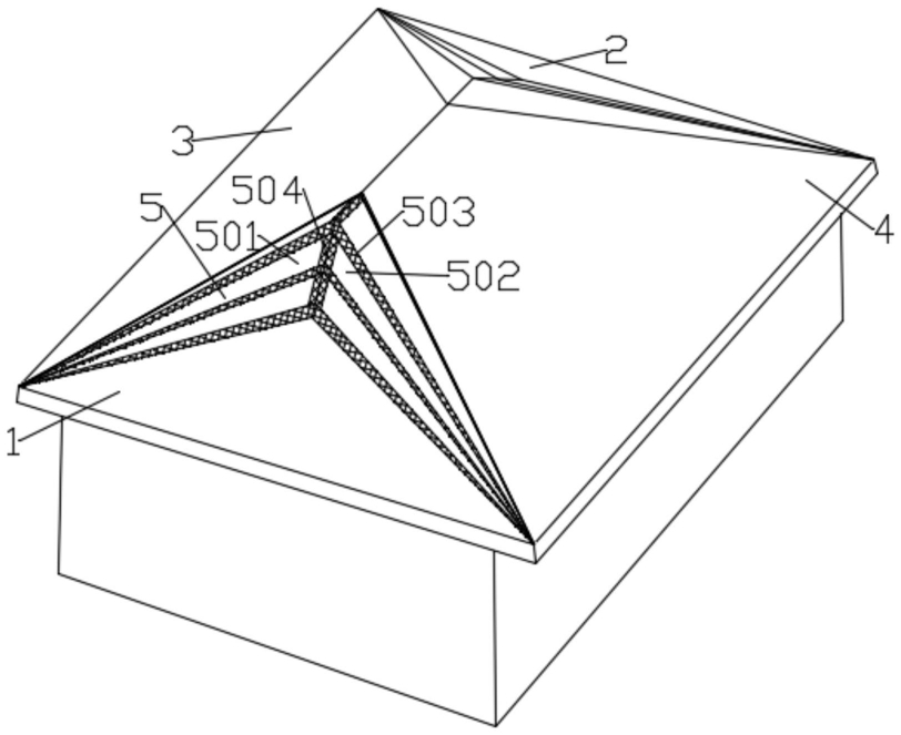 1.一种四坡面宽度可调的风载荷实测房,其特征在于,包括由第一盖板、第二盖板、第三盖板和第四盖板组成的等四坡屋面,所述第一盖板和第二盖板相对且均为三角形,所述第三盖板和第四盖板相对且均为梯形,所述第一盖板和第二盖板分立于第三盖板和第四盖板的两侧且分别与第三盖板和第四盖板之间设置有若干组过渡面,相邻两组过渡面之间设置有第一柔性连接面,所述过渡面的底部设置有升降结构,所述过渡面位于上极限位置时,用于组成第三盖板和第四盖板的一部分,所述过渡面位于下极限位置时,用于组成第一盖板和第二盖板的一部分。