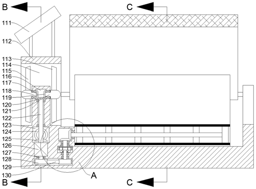 3.根据权利要求1中的一种木材干燥装置,其特征在于:所述主动力腔右侧端壁内设置有翻滚动力腔,所述翻滚动力腔与所述干燥腔之间转动设置有左右延伸的翻滚动力轴,所述翻滚动力轴与所述翻滚动力轮固定连接,所述翻滚动力腔内的所述翻滚动力轴左侧末端固定设置有翻滚动力输入锥齿轮,所述主动力腔底部端壁内设置有翻滚皮带腔,所述翻滚皮带腔内转动设置有上下延伸的主动皮带轴,所述主动皮带轴顶部末端与所述驱动电机动力连接,所述主动皮带轴底部末端固定设置有主动带轮,所述翻滚皮带腔顶部端壁内设置有减速腔,所述减速腔与所述翻滚皮带腔之间转动设置有上下延伸的高速轴,所述翻滚皮带腔内的所述高速轴底部末端固定设置有从动带轮,所述从动带轮与所述主动带轮之间传动设置有翻滚动力皮带,所述减速腔内的所述高速轴顶部末端固定设置有高速恒星齿轮,所述减速腔与所述翻滚动力腔之间转动设置有上下延伸的低速轴,所述减速腔内的所述低速轴底部末端固定设置有低速内齿圈,所述低速内齿圈与所述高速恒星齿轮之间传动设置有传动行星齿轮,所述翻滚动力腔内的所述低速轴顶部末端固定设置有翻滚动力输出锥齿轮,所述翻滚动力输出锥齿轮与所述翻滚动力输入锥齿轮啮合,有利于保证所述翻滚带的持续缓慢的转动,保证所述干燥腔内的木材均可受风干燥。