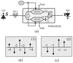 1.一种利用偏振分路复用马赫-曾德尔调制器的二倍频三角波和方波生成方法,包括激光器LD、射频信号LO、偏振控制器PC1、偏振分路复用马赫-曾德尔调制器PDM-MZM、掺饵光纤放大器EDFA以及光电探测器PD,其中PDM-MZM包括一个3dB功分器、两个子调制器MZM1和MZM2、一个90°偏振旋转器PR和一个偏振合束器PBC,其特征在于,由激光器输出的光载波经过PC1后直接注入到PDM-MZM的输入端被功分为两路,一路输入到工作在最大点的MZM1中被射频信号调制,生成载波、正负二阶边带和正负四阶边带,另一路输入到工作在最小点的MZM2中,生成正负一阶边带和正负三阶边带,MZM2调制器输出的光信号经90°偏振旋转器后与MZM1输出的光信号通过偏振合束器PBC在PDM-MZM输出端合成为正交偏振复用信号,正交偏振复用信号由EDFA放大后经光电探测器PD拍频得到电信号,电信号包括二倍频谱和六倍频谱,通过控制射频信号LO的输出功率,使得调制指数分别约为1.95和2.22,此时PD输出电信号中的二倍频谱和六倍频谱的功率比约为19.2dB和9.6dB,可以近似产生二倍频三角波和二倍频方波。