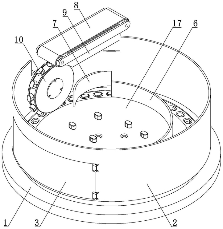 6.根据权利要求5所述的一种轻质零件分拣设备,其特征在于:所述导向板(6)为沿一涡状线延伸而成的板体,所述挡板(7)为沿一圆弧延伸而成的板体,所述挡板(7)的一端紧贴所述围板(2)的内壁,另一端横跨所述弧形块(4)至所述转盘一(17)的上方。