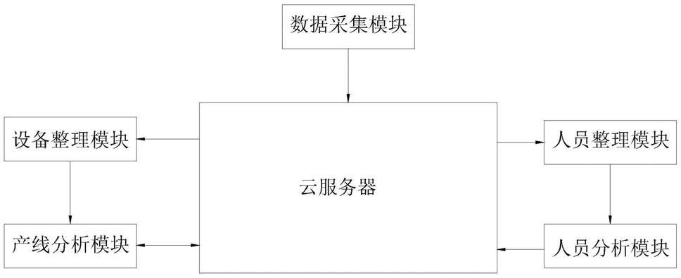 所述数据采集模块用于采集生产线上的工作人员信息和生产线设备信息;所述工作人员信息包括工作编号、工作时间、学历和签到时间;所述生产线设备信息包括设备型号、设备工作时间、启停次数、设备维修次数和对应的维修时间;所述数据采集模块将采集的生产线上的工作人员信息和生产线设备信息发送至云服务器进行存储;所述设备整理模块用于对生产线设备进行整理,具体整理步骤如下:步骤一:将生产线按照生产方向将生产线依次分为若干个区域,并标记为Ai,i=