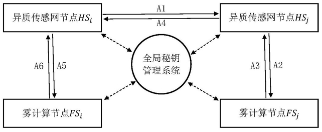 2.如权利要求1所述的基于雾计算架构的异质传感网节点匿名身份认证方法,其特征在于,步骤A1至A5中,所述加密发送具体为:将需要发送的内容与其摘要的组合,基于发送节点和接收节点的共享秘钥SK1或SK4进行加密。