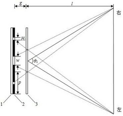 其中,p是矩形针孔的水平节距,w是位于渐变宽度矩形针孔阵列中心的矩形针孔的水平孔径宽度,m是渐变宽度矩形针孔阵列中水平方向上矩形针孔的数目,l是观看距离,g是渐变宽度矩形针孔阵列与显示屏的间距,a是渐变宽度矩形针孔阵列的垂直宽度与水平宽度的比值。