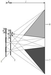 其中,q是矩形图像元I的水平节距,w是矩形针孔的水平孔径宽度,m是矩形针孔阵列中水平方向上矩形针孔的数目,l是观看距离,g是显示屏与矩形针孔阵列的间距,a是显示屏的垂直宽度与水平宽度的比值。