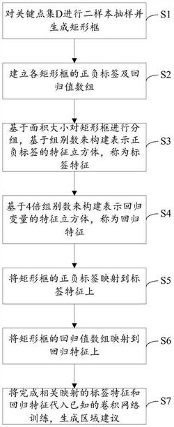 8.如权利要求6所述基于关键点的区域建议生成方法,其特征在于,回归值数组到回归特征的映射方法具体如下:针对矩形框aij,(1)若矩形框面积s(aij)大于16,将图像的最大面积Smax除以矩形框面积S(aij),若Smax/S(aij)的比值落在[2k,2k+1)的区间内,则将矩形框aij的正标签或负标签映射到特征的第k个通道上的[ctij/shrank]坐标点处,其中k=0,1,2,…,c-2;(2)若矩形框面积S(aij)小于等于16,则将矩形框aij的正标签或负标签映射到特征的第c-1个通道上的[ctij/shrank]坐标点处,其中,ctij为矩形框aij中心点坐标。