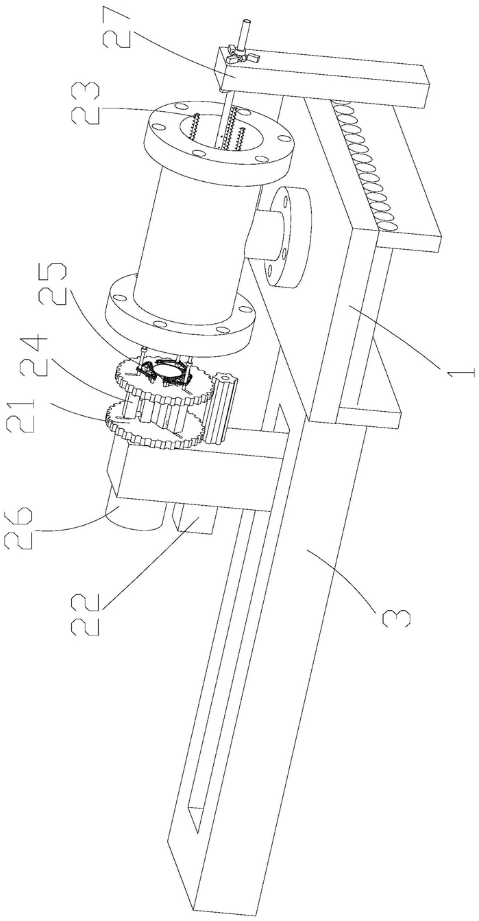 6.按照权利要求1所述的一种大型阀体的生产工艺,其特征在于:所述第三驱动件(26)包括转动设于移动架上的第二转轴(261)、固定设于第二转轴一端的第二主动齿轮(262)、驱动第二转轴转动的第二电机(263),所述第二转轴贯穿转盘,所述第二主动齿轮与链条齿合;第二电机驱动第二转轴转动,固定设于第二转轴上的第二主动齿轮转动,驱动传动部件运行。