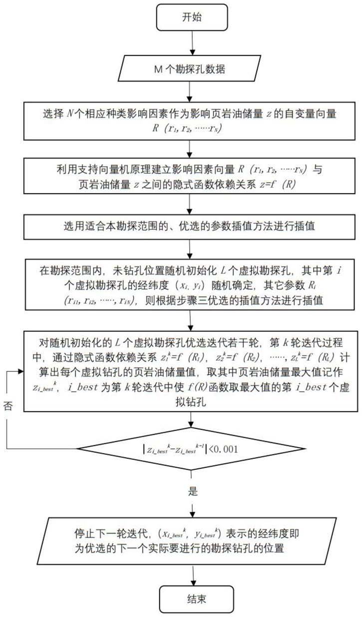 步骤五:对随机初始化的L个虚拟勘探孔优选迭代若干轮,第k轮迭代过程中,通过隐式函数依赖关系 计算出每个虚拟钻孔的页岩油储量值,取其中页岩油储量最大值记作zi_bestk,i_best为第k轮迭代中使f(R)函数取最大值的第i_best个虚拟钻孔,若|zi_bestk-zi_bestk-1|<0.001则停止下一轮迭代,(xi_bestk,yi_bestk)表示的经纬度即为优选的下一个实际要进行的勘探钻孔的位置。