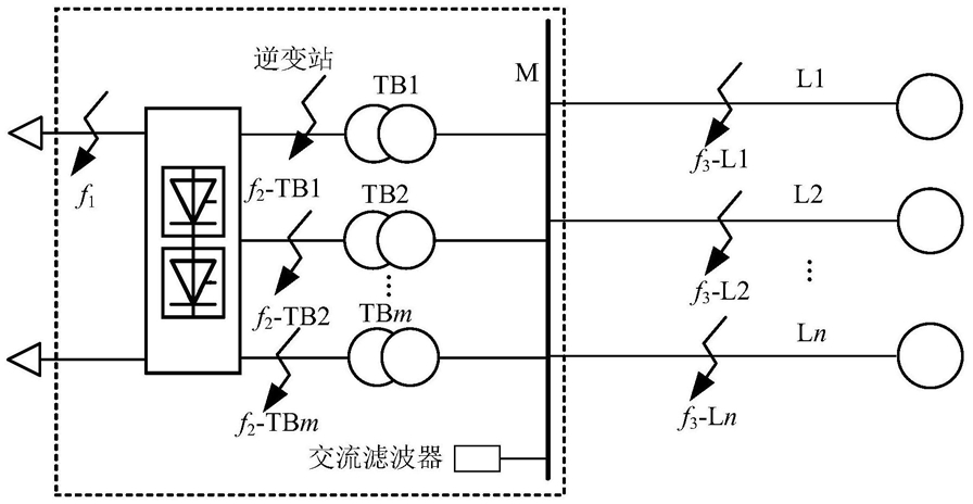 步骤B1:实时获取在故障后即t0时刻后逆变站的m个换流变压器一次侧的三相电流信号iA_TBj、iB_TBj和iC_TBj,j=1,2,…m;实时获取在t0时刻后逆变站区外的n条交流线路近逆变站端的三相电流信号:iA_Lk、iB_Lk和iC_Lk,k=1,2,…n;
