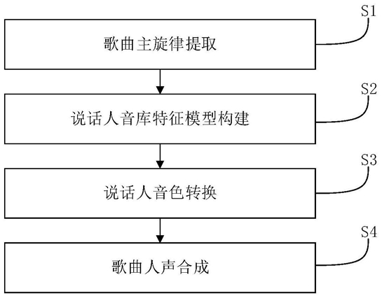 步骤S4:人声合成,具体包括以下步骤:步骤S41:文字到语音TTS转换:利用原始歌曲音频的歌词,使用TTS系统生成对应的发音,即通过建立一个汉字到拼音的映射表,利用步骤S3中建立的目标说话人音库模型,生成单字的读音;