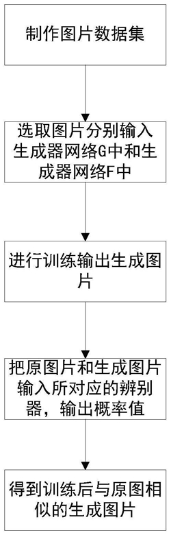 步骤3.3.3、循环一致性损失:把步骤3.1中生成的图片y'即图片G(x)再经过生成器F训练,得到图片F(G(x));把步骤3.2中生成的图片x'即图片F(y)再经过生成器G训练,得到图片G(F(y));循环一致性损失定义如下所示:Lcyc(F,G,X,Y)=Ex~pdata(x)[||F(G(x))‑x||1]+Ey~pdata(y)[||G(F(y))‑y||1]其中,F(G(x))是步骤3.1中的图片x通过生成器G生成的图片y'再通过生成器F训练出来的图片,G(F(y))是步骤3.2中的图片y通过生成器F生成的图片x'再通过生成器G训练出来的图片;||F(G(x))‑x||1表示通过两次生成器训练生成的图片F(G(x))与原风格A的图片x做均方误差,||G(F(y))‑y||1是通过两次生成器训练生成的图片G(F(y))与原风格B的图片y做均方误差,值越小说明训练生成的图片效果越好;