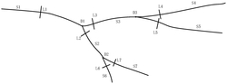步骤6:绘制船舶的历史航行轨迹图,在历史航行轨迹图中标注船舶的历史航行轨迹Si、船舶经过某一段航线的航路节点Lj以及船舶航向分叉节点Dk;
