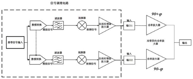 步骤一:将待传输调制信号经过PC端角度调制、数模转换芯片、低通滤波器、混频器、自适应增益放大器得到两路等幅异向的待输入调制信号;其中,数模转换芯片将数字基带信号转换为模拟调制信号;低通滤波器用于消除基带信号的杂波成份;正交混频器用于将基带信号调制到载波频率上;自适应增益控制器用于将射频调制信号的幅度调整到合适的大小以待输入到后端放大器中;