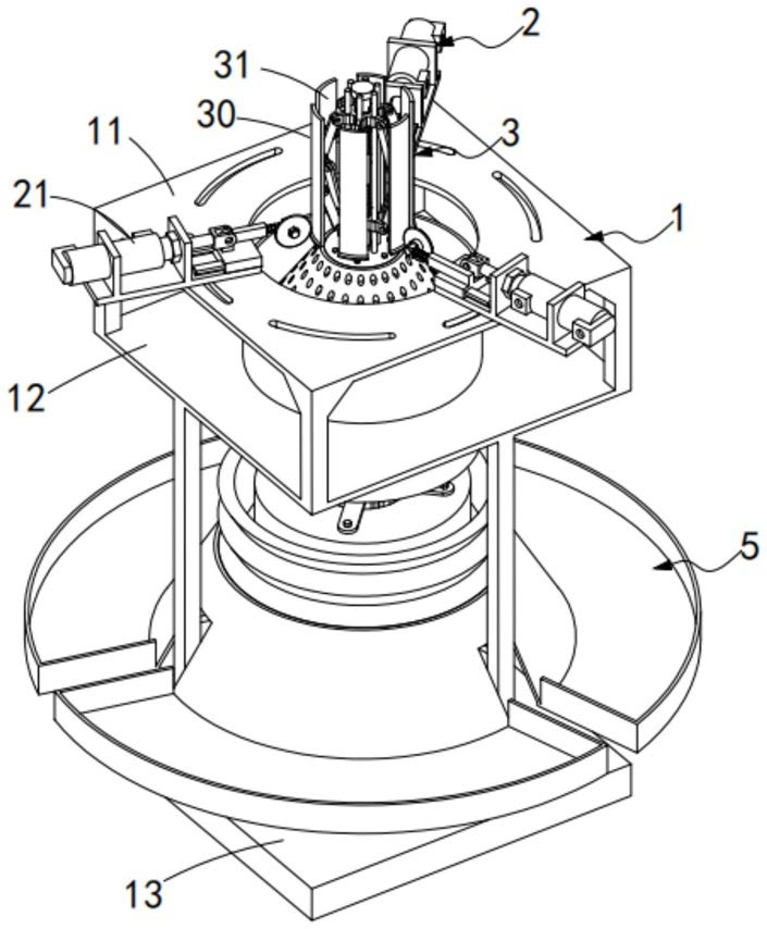 承料机构(3),所述承料机构(3)安装于所述机架(1)的轴线上,其沿该机架(1)的轴线上下升降穿透所述第一安装板(11)及所述第二安装板(12)设置,且该承料机构(3)包括若干绕其轴线圆周阵列设置的承料板(31)及控制该承料板(31)围绕其轴线伸缩扩张调节的调节组件(32),所述承料板(31)组合形成套设待切割的纸质管的承料筒(30);