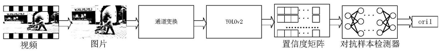 4)训练检测器:将步骤3.5)中经过变换后的图片输入目标检测器,得到每帧的类置信度矩阵;用该矩阵训练对抗样本检测器;这里取交叉熵作为检测器的损失函数:如式(8):式中,m表示训练集总数,x表示训练集,y表示x的标签,h()表示样本x的标签为1的概率。