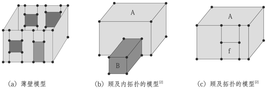 语义赋值:构面后,为面赋予语义信息,对于三维纵向面,迭代循环每个面,找出面中Z值最小的结点,Z值最小的结点可能不止一个,任取其中一个即可,若该结点的Z值等于平面图中生成该面的边的起始高度,则为这个面赋予该边的类型,其它剩余的面赋予墙面类型即可,赋予语义后,根据拓扑基元之间的关联性,将围成每个体的面找出并自动构体,实现拓扑的重建。