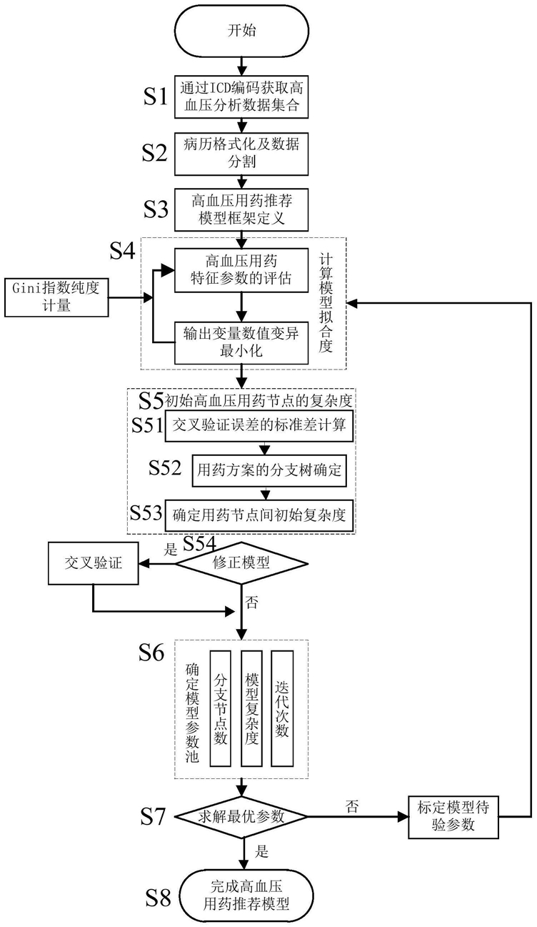S8、模型构建及预测:S81、模型构建:通过步骤S4、S5、S6、S7的步骤,将测试集中每个样本归类到终端节点的用药方案,并根据终端节点中本单元用药方案的众数判断节点的属性;S82、样本预测:对于验证集中的每一个样本执行高血压用药推荐模型,得到其终端节点,并根据S81得到模型预测的所属用药方案,从而实现模型的评价与校验;