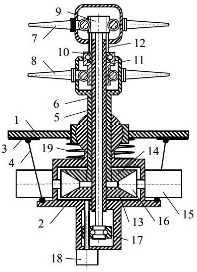 所述倾翼机构包括辅电机、心轴、丝母、拉杆组、圆环、齿轮套;所述心轴上端、中部和下端分别设有同轴凸圆齿轴、光轴和凸圆盘;所述圆环的内孔与内套外圆圆柱副联接,所述圆环的外圆与齿轮套的内孔转动副联接;所述拉杆组穿过所述内套上端第一箱体底面的轴向通孔,所述拉杆组的上端与心轴的凸圆齿轴下端面轴向固连,所述拉杆组的下端与圆环端面轴向固连;所述心轴的凸圆齿轴和齿轮套分别与所述正、反旋翼的齿轮啮合;所述丝母轴向设有中心通孔和偏心螺纹通孔,中心通孔与心轴下端的凸圆盘转动副联接,所述辅电机与动台下端轴向固连,其螺纹驱动轴穿过所述动台下端偏心通孔与丝母的螺纹通孔螺旋联接,所述机座与动台两者之间固定安装弹簧,所述弹簧两端分别抵在机座和动台上。