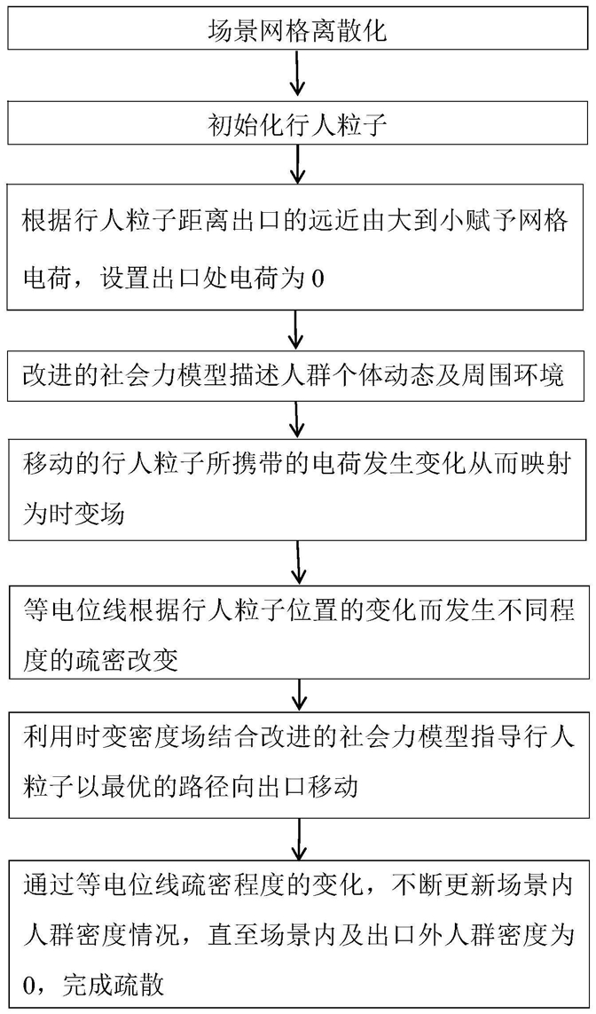 疏散模块,被配置为:将移动的行人粒子所携带的电荷发生变化映射为时变场,利用时变场中等电位线疏密程度体现行人粒子位置的变化而发生不同程度的疏密改变;