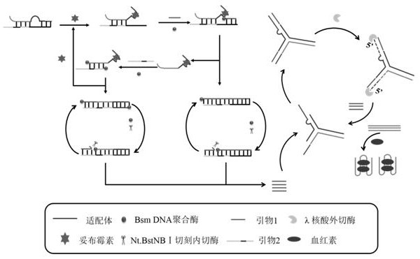 (4)形成G-四链体/血红素:将步骤(2)所得混合液与步骤(3)所得混合溶液混匀,在37℃孵育120 min;加入1 6 U λ核酸外切酶,1×λ核酸外切酶反应缓冲液,混匀后在37℃酶促~反应30 150 min产生大量单链S1;然后加入400 μL工作缓冲液和10 μL氯化血红素,并将混~合物在25℃温育60 min以形成G-四链体/血红素复合物;