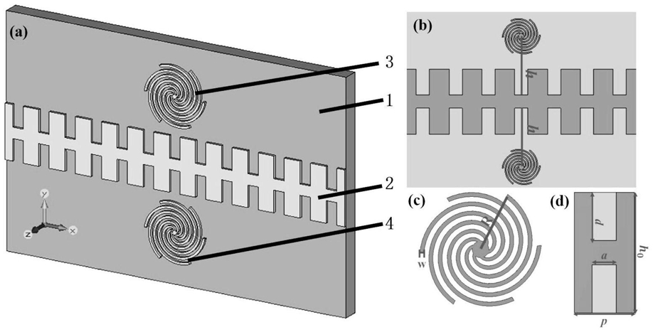 1.一种模式可控的矢量涡旋光束生成装置,其特征在于,包括电磁波发射装置、电磁波接收装置、控制器、可调式阿基米德螺旋金属颗粒、人工表面等离激元波导、介质基板,其中,人工表面等离激元波导设置于介质基板上方,其输入端与电磁波发射装置输出端连接,其输出端与电磁波接收装置输入端连接;可调式阿基米德螺旋金属颗粒对称设置于人工表面等离激元波导的两侧;所述可调式阿基米德螺旋金属颗粒的厚度、阿基米德金属旋臂宽度固定,其半径、阿基米德金属旋臂数目、位置均可调;人工表面等离激元波导,采用H型金属周期槽结构;