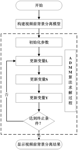 利用交替方向乘子法对基于广义非凸鲁棒主成分分析的视频前背景分离模型求解,得到低秩矩阵L和稀疏矩阵S;