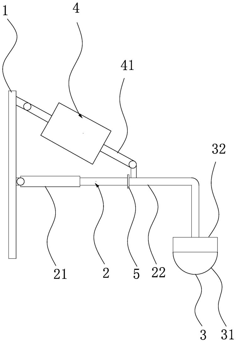 1.一种远洋渔场用波浪能转换装置,其特征在于,包括竖向固设在远洋渔场外围的立柱(1),所述立柱(1)上连接有横向的伸缩杆(2),所述伸缩杆(2)位于海水的上方且一端与所述立柱(1)的侧部相铰接,所述伸缩杆(2)的另一端向下弯折且端部固设有漂浮在海水上的浮子(3),所述伸缩杆(2)的上方设有向下倾斜的液压缸组(4),所述液压缸组(4)的上端与所述立柱(1)的上端外侧相铰接,所述液压缸组(4)的下端设有活塞杆(41),所述活塞杆(41)的端部铰接在所述伸缩杆(2)上,所述浮子(3)上下波动能够带动所述活塞杆(41)沿所述液压缸组(4)的长度方向往复移动,所述液压缸组(4)还连接有能够发电的液压马达;所述伸缩杆(2)的长度为海水波浪波长的0.5n倍,n为自然数;所述伸缩杆(2)包括固定套(21)和活动杆(22),所述固定套(21)的内端与所述立柱(1)的中部外周面相铰接,所述活动杆(22)的一端插设在所述固定套(21)的外端且能沿所述固定套(21)的长度方向往复滑动,所述活动杆(22)呈L型,所述浮子(3)固定在所述活动杆(22)的另一端,所述液压缸组(4)的活塞杆(41)的端部与所述活动杆(22)的上侧面相铰接;所述活动杆(22)的外周面上固设有挡环(5),所述挡环(5)靠近所述活塞杆(41)与所述活动杆(22)的铰接点;