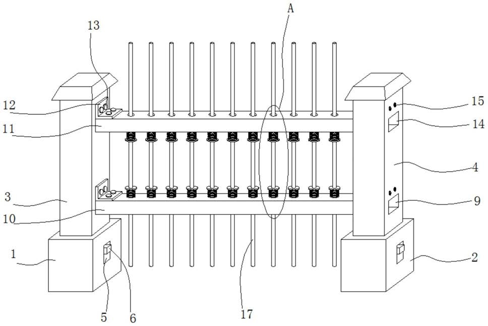 1.一种抗震抗风围栏,其特征在于:包括第一限位支座、第二限位支座、限位插柱、第一限位插孔、L型固定脚座、螺栓、第二限位插孔、螺纹孔,所述第一限位支座上连接有第一竖支撑柱;所述第一竖支撑柱内壁通过L型固定脚座和螺栓固定连接有第二横支撑柱;所述第一竖支撑柱内壁相对于第二横支撑柱的下方通过L型固定脚座和螺栓固定连接有第一横支撑柱;所述第二横支撑柱的另一端和第一横支撑柱的另一端均通过L型固定脚座和螺栓固定连接有第二竖支撑柱;所述第二竖支撑柱的下端连接有第二限位支座,第一竖支撑柱和第二竖支撑柱上均设置有第一限位插孔和第二限位插孔;第二横支撑柱的两端分别穿过第二限位插孔分别与第一竖支撑柱和第二竖支撑柱固定连接;第一横支撑柱的两端分别穿过第一限位插孔与第一竖支撑柱和第二竖支撑柱固定连接;所述第二横支撑柱和第一横支撑柱上均均匀设置有若干栏杆插孔,第二横支撑柱和第一横支撑柱上的栏杆插孔一一对应设置;所述第二横支撑柱和第一横支撑柱之间均匀设置有若干栏杆;栏杆上分别设置有第二缓冲弹簧;所述第二缓冲弹簧固定连接有第一限位挡圈;所述栏杆上相对于第一限位挡圈的下方设置有第二限位挡圈;所述第二限位挡圈上固定连接有第三缓冲弹簧,第二缓冲弹簧设置在第二横支撑柱的下端;所述第三缓冲弹簧设置在第一横支撑柱的上端;所述第一竖支撑柱和第二竖支撑柱的下端分别设置有第一缓冲弹簧;所述第一限位支座和第二限位支座上均设置有限位安装槽;若干所述第一缓冲弹簧的另一端分别与限位安装槽固定连接;所述第一竖支撑柱通过限位插柱与第一限位支座连接;所述第二竖支撑柱通过限位插柱与第二限位支座连接;所述第一限位支座和第二限位支座上均设置有限位顺槽,限位顺槽分别与限位插柱相适应;所述第一竖支撑柱和第二竖支撑柱上分别设置有与限位顺槽相匹配且便于限位插柱穿插的插柱插孔。