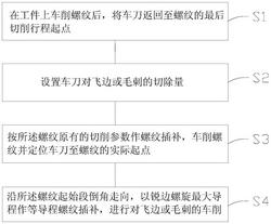 按所述螺纹原有的切削参数作螺纹插补,车削螺纹并定位车刀至螺纹的实际起点:按所述螺纹的导程P车削螺纹至螺纹实际起点A[XA,ZA],其中,ZA为点A的轴向坐标,ZA=[h-hc]*sin[c]*cos[t]/sin[90-t-c],式中,h为所述螺纹的螺纹牙型高度,t为所述螺纹的锥半角角度,c为所述螺纹的倒角角度,hc为螺纹起始端倒角的径向高度,XA为点A的径向坐标,XA=[ZS-ZA]*tan[t]*2+XS;