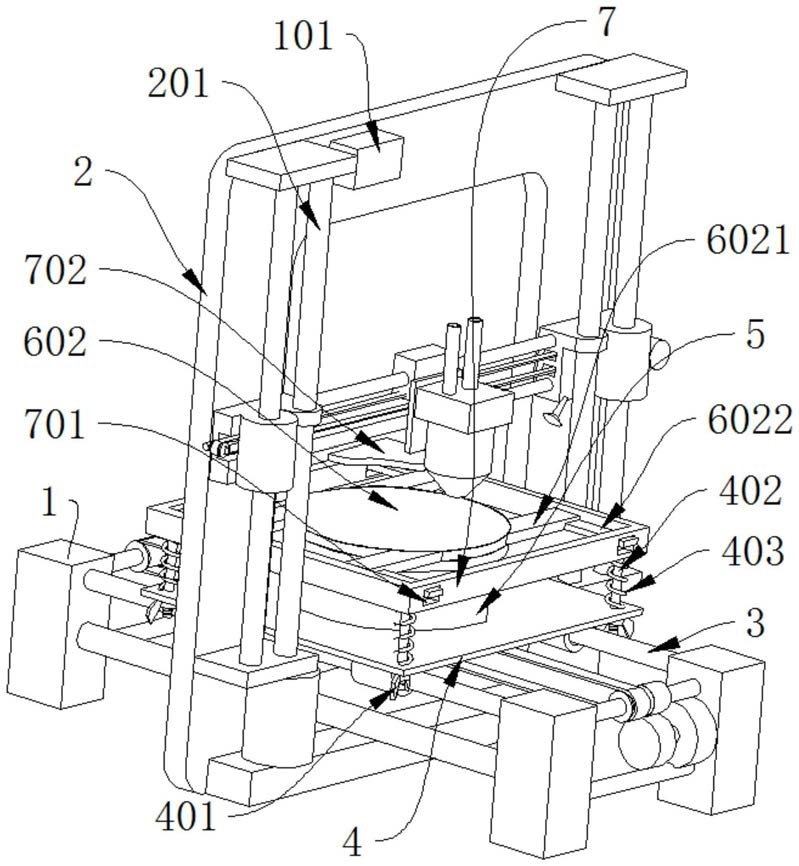 1.一种方便调节打印台平衡的泥塑打印机,包括底座(1)、控制器(101)、支撑架(2),其特征在于,所述支撑架(2)固定连接在底座(1)的顶部,所述支撑架(2)通过第一滑杆(201)滑动连接有打印组件,所述底座(1)上固定连接有第二滑杆(3),所述第二滑杆(3)上滑动连接有第一面板(4),所述第一面板(4)上端微调机构连接有测量盒体(7),所述第一面板(4)顶部固定连接有密封箱体(5),所述密封箱体(5)内设有浮板(6),所述浮板(6)上固定连接有连杆(601),所述连杆(601)远离浮板(6)的一端穿过测量盒体(7)连接有第二面板(602),所述第二面板(602)上固定连接有第一支杆(6021),所述测量盒体(7)上设有通槽(701),所述第一支杆(6021)上固定连接有与通槽(701)对应的第二支杆(6022),所述测量盒体(7)顶部连接有第三面板(702)。