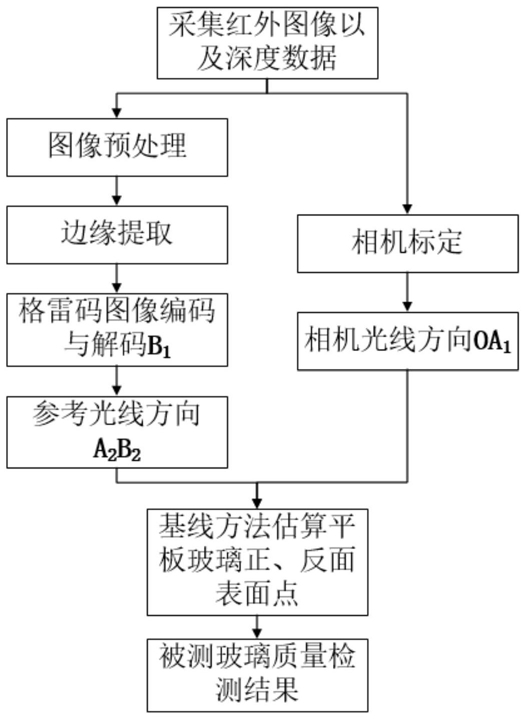 1.一种基于激光连续波调制原理的平板玻璃质量检测方法,其特征在于,包括以下步骤:步骤1,通过图像采集模块利用深度相机采集红外图像和深度数据并存储在计算机中,外图像包含格雷码图像和标定相机所需的棋盘图像;