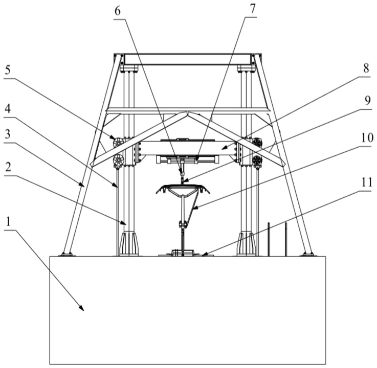 4.根据权利要求1所述的一种受电弓/接触网耦合系统运行试验台,其特征在于:所述两个“A字形”支架(3)同侧的支杆中上部均设有顺顶梁方向的横撑,横撑中部与两侧的支杆间设有“八字”撑。