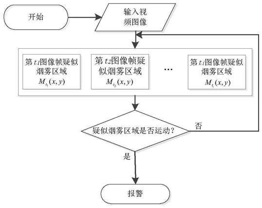 对于单帧的疑似烟雾区域与连续两帧的火灾烟雾增长率不具备代表性,选择图像帧数量或者时间间距相同的t1,t2,...,ti图像帧,i的所取数值取决于Di(x,y)>T产生的次数,由式(9)描述:式(9)中,设定T是阈值,tv为视频图像的延续时间,若疑似烟雾区域增长超过阈值时,则疑似烟雾区域运动,判定为火灾烟雾图像,给出火灾报警,若疑似烟雾区域增长不超过阈值时,疑似烟雾区域不运动,则返回视频输入进行下一图像的处理流程。