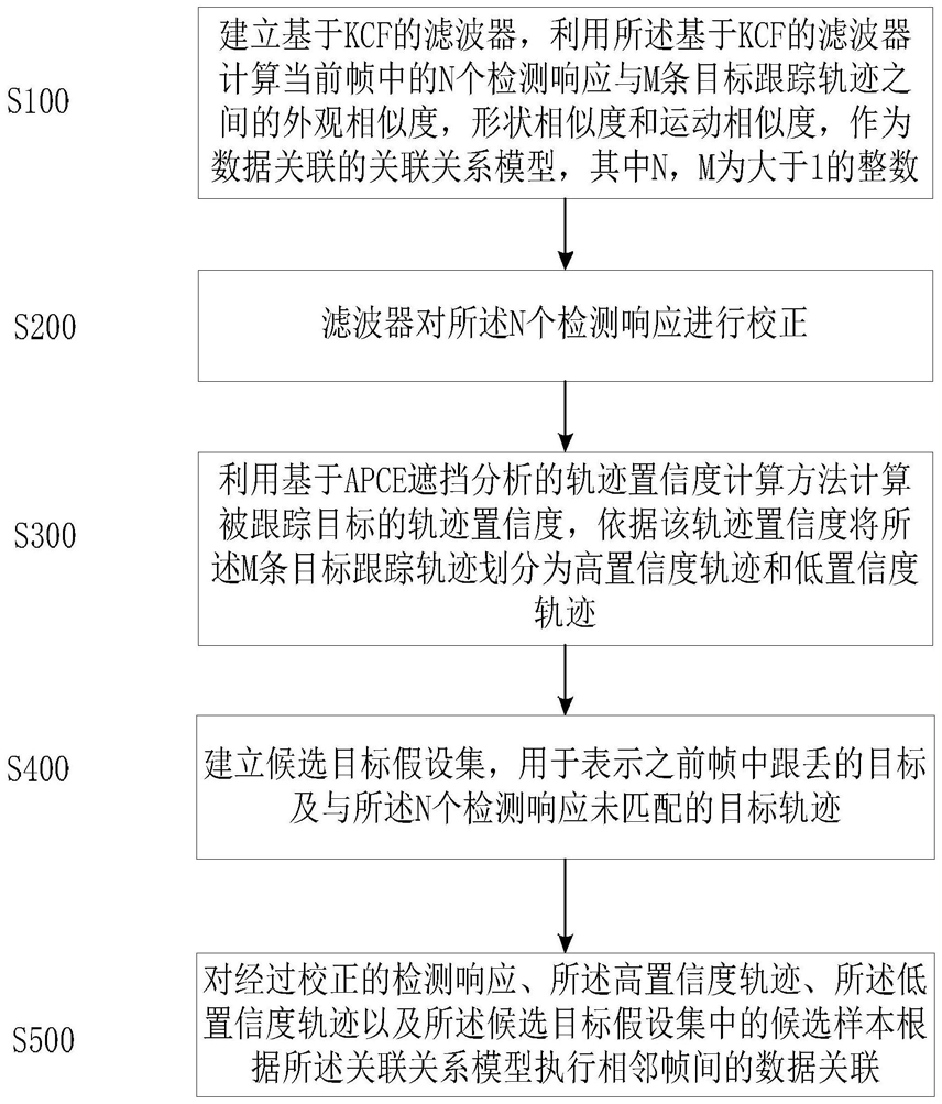 S500:对经过校正的检测响应、所述高置信度轨迹、所述低置信度轨迹以及所述候选目标假设集中的候选样本根据所述关联关系模型执行相邻帧间的数据关联;