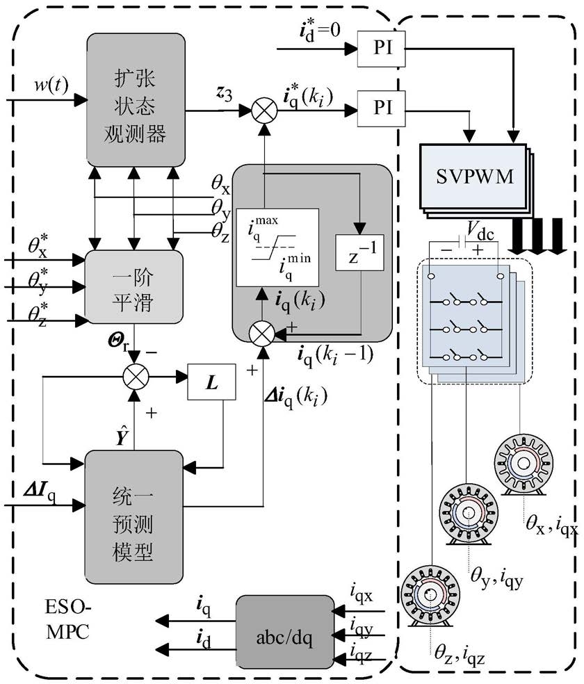 q轴电流跟踪误差扰动 外部扰动w(t), 为输出q轴电流参考值,Jeqi=Ji+Miuiri/2π,Beqi=Bi+B’iuiri/2π,θ为电机机械位置角,下标i=x、y、z,分别代表多轴运动系统的电机,Ji代表电机转动惯量,Jeqi代表等效电机转动惯量,Bi为粘性系数,Beqi为粘性系数,B’i为运动粘性摩擦系数,Mi为运动机构滑块质量,ui为多轴运动系统中年驱动电机转一圈滑块对应的位移,ri为运动机构同步轮半径;