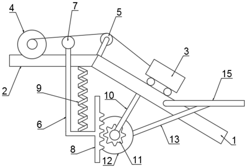 1.一种防坠落矿车轨道,包括轨道(1),其特征在于,所述轨道(1)上滑动有矿车(3),所述轨道(1)的端部固定有安装板(2),所述安装板(2)的上侧壁固定有卷扬机(4),所述卷扬机(4)的驱动端与矿车(3)之间固定连接有钢丝绳,所述安装板(2)靠近轨道(1)的一端上侧壁固定有支杆,所述支杆的上端安装有导线轮一(5),所述安装板(2)上插设有升降板(6),所述升降板(6)的上端安装有导线轮二(7),所述钢丝绳绕过导线轮一(5)和导线轮二(7)设置,所述升降板(6)呈L型板设置,所述升降板(6)的端部固定有竖板(8),所述升降板(6)的端部与安装板(2)的下侧壁之间固定有挤压弹簧(9),所述轨道(1)的下侧壁固定有倾斜设置的连杆(10),所述连杆(10)的端部安装有齿轮(11),所述竖板(8)位于齿轮(11)的一侧且竖板(8)的外壁上设有与齿轮(11)相啮合的锯齿,所述齿轮(11)的外壁上固定有圆盘(12),所述圆盘(12)的外壁上固定有两个固定杆(13),每个所述固定杆(13)的端部均固定有卡柱(14),所述轨道(1)的两侧外壁上均固定有固定板(15),所述轨道(1)的外壁转动连接有位于每个固定板(15)内侧的转板,位于轨道(1)两侧的所述固定板(15)与转板之间固定有伸缩弹簧(16),两个所述卡柱(14)分别插设在其中一个转板与轨道(1)的外壁之间。