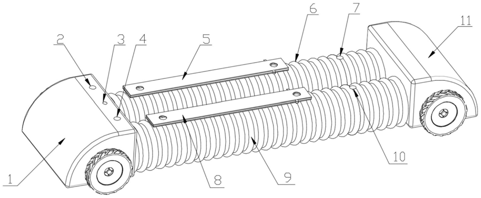 两根第一伸缩管和第二伸缩管上均设置有蛇皮薄膜;蛇皮薄膜包括主体膜和仿蛇鳞片;主体膜的外侧面设置有多片仿蛇鳞片;仿蛇鳞片的内端均与主体膜固定;仿蛇鳞片外端的朝向一致;主体膜上的仿蛇鳞片与地面接触。