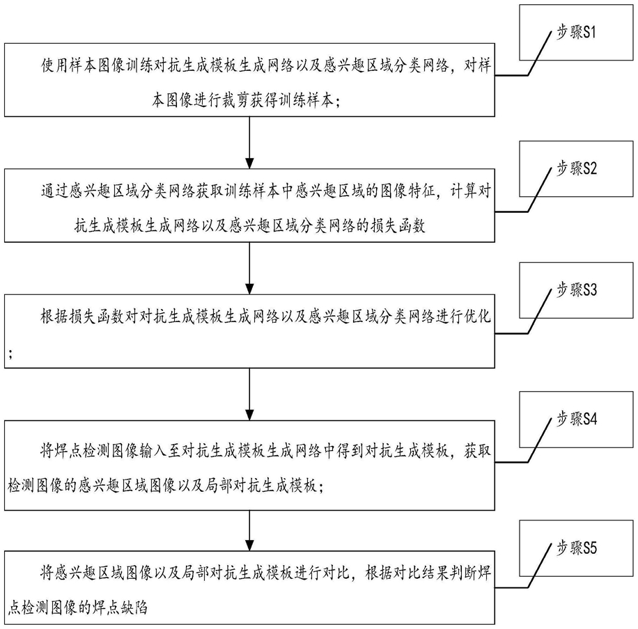 8.一种焊点缺陷检测系统,其特征在于,所述系统包括图像裁剪模块、对抗生成模板生成网络模块、感兴趣区域分类网络模块、损失函数计算模块、焊点检测模块;