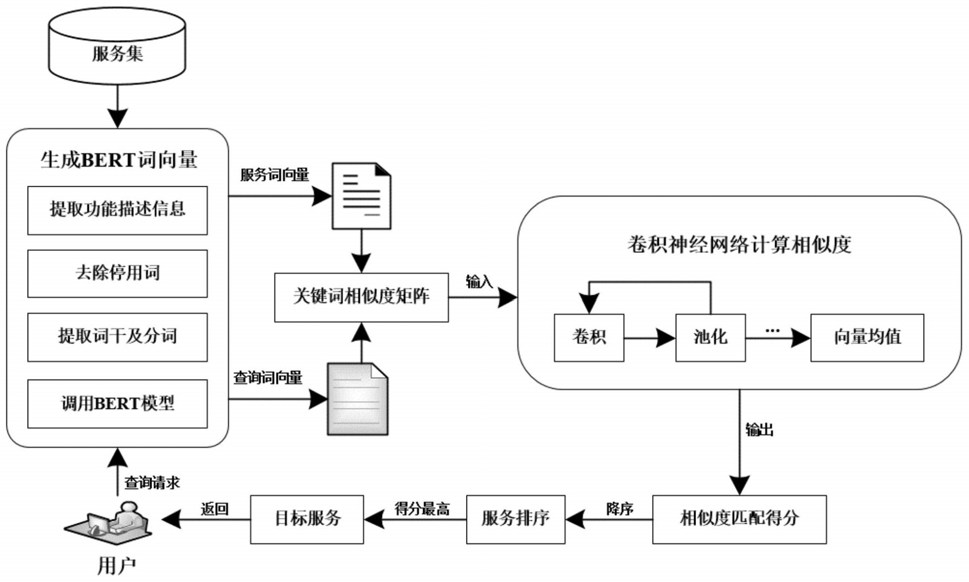 步骤4,对于每一条查询请求,逐一与服务集中的候选服务进行步骤2和3操作,并根据步骤3所得相似度匹配得分对候选服务进行排序,从而找到最高相似度匹配得分所对应的服务为所要查询的目标结果。