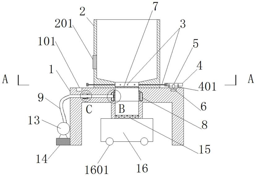 1.一种用于生物质能燃烧机的自动清理废渣的装置,包括支撑架(1),其特征在于:所述支撑架(1)的上端开设有环形滑槽(101),支撑架(1)的中部开设有通孔(102),撑架(1)的内部左侧开设有柱形槽(103),支撑架(1)的上端固定连接有燃烧桶(2),燃烧桶(2)的左端设置有进料口(201),燃烧桶(2)的下部外侧开设有弧形槽(202),燃烧桶(2)的下端开设有排渣口(203),燃烧桶(2)的下侧且在弧形槽(202)内滑动连接有清理杆(3),清理杆(3)的外端设置有挡板(301),挡板(301)与燃烧桶(2)之间固定连接有第一弹簧(302),挡板(301)的外侧滑动连接有圆盘(4),圆盘(4)的下侧左右两侧均转动连接有滚轮(401),圆盘(4)的下部中侧固定连接有驱动装置(5),驱动装置(5)的下端转动连接有齿轮(6),燃烧桶(2)的下端且在排渣口(203)的位置固定连接有栅格网(7),撑架(1)的内部且在通孔(102)的外侧固定连接有导气装置(8),导气装置(8)的内部开设有环形气槽(801),导气装置(8)的里侧壁开设有喷气口(802),导气装置(8)的左侧插接有进气管(9),进气管(9)的外侧且在柱形槽(103)内固定连接有环形块(10),环形块(10)的下端固定连接有金属球(1001),支撑架(1)的内部且在柱形槽(103)的左下侧固定连接有金属球(1001)对应的可变电阻(11),环形块(10)的左侧和柱形槽(103)的左侧固定连接有第二弹簧(12),进气管(9)的下端固定连接有气泵(13),气泵(13)的下端固定连接有固定板(14),支撑架(1)的中部下端设置有电磁阀(15),电磁阀(15)的正下方设置有收集箱(16),收集箱(16)的下端滚动连接有万向轮(1601);