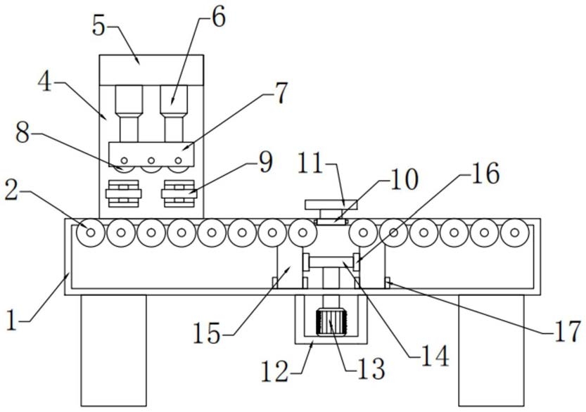 1.一种滑轨外轨测量装置,包括检测台(1),其特征在于,所述检测台(1)顶端设置有第一滑槽(3),所述第一滑槽(3)内侧设置有若干滚筒(2),所述滚筒(2)左右两侧均轴承连接设置有与检测台(1)固定连接的固定板(21),所述检测台(1)左端顶部设置有送料机构,所述送料机构右侧设置有检测机构,所述送料机构包括支撑柱(4),所述支撑柱(4)设置在滑槽(3)前后两侧,所述支撑柱(4)与检测台(1)固定连接,所述支撑柱(4)顶部固定连接设置有顶板(5),所述顶板(5)底部固定连接设置有第一伸缩杆(6),所述第一伸缩杆(6)底部固定连接设置有压板(7),所述压板(7)内轴承连接设置有若干用于驱动滑轨移动的电动滚轮(8),所述电动滚轮(8)下侧设置有固定机构,所述固定机构包括第二伸缩杆(22),所述第二伸缩杆(22)固定连接设置在支撑柱(4)上,所述第二伸缩杆(22)另一端固定连接设置有固定块(23),所述固定块(23)内侧滑动连接设置有滑块(24),所述滑块(24)与固定块(23)之间固定连接设置有第二弹簧,所述滑块(24)内侧轴承连接设置有滑轮(9),所述检测机构包括活动框(18),所述活动框(18)设置在第一滑槽(3)前后两侧,所述活动框(18)与设置在检测台(1)顶端的第二滑槽(25)滑动连接,所述活动框(18)内侧固定连接设置有用于检测拉力的检测器(19),所述检测器(19)通过第一弹簧(20)与活动板(10)连接,所述活动板靠近第一滑槽(3)一端顶部轴承连接设置有测量滚轮,两侧所述活动框(18)底端均与调节机构连接,所述调节机构包括支撑框(12)和电机(13),所述支撑框(12)螺栓连接设置在检测台(1)底部,所述支撑框(12)内侧螺栓连接设置有电机(13),所述电机(13)上侧输出端与齿轮(14)连接,所述齿轮(14)左右两端均啮合连接设置有齿条(16),两侧所述齿条(16)分别与设置在活动框(18)底部的连接块(15)固定连接,所述连接块(15)与检测台(1)滑动连接。