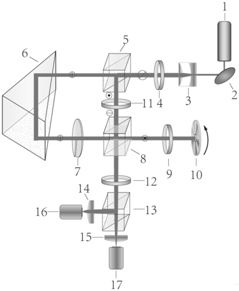 1.一种基于马赫-泽德干涉的旋转体角速度光学测量系统,包括激光光源(1)、第一偏振分束镜(5)、第二偏振分束镜(8)、分光棱镜(13)、螺旋相位片(7)、四分之一波片(9)和光电探测器,激光光源用于产生线偏振激光,激光经半波片(4)旋转偏振方向后照射于第一偏振分束镜上,激光经第一偏振分束镜后的透射光和反射光分别作为信号光和参考光;其特征在于:信号光经螺旋相位片(7)转化为角量子数为l的线偏振涡旋光,涡旋光照射于第二偏振分束镜(8)上,第二偏振分束镜实现对照射于其上涡旋光的完全透射,第二偏振分束镜透射的涡旋光经四分之一波片(9)后垂直照射于待测旋转体(10)上;照射于待测旋转体上的涡旋光被反射后再次经过四分之一波片,涡旋光的偏振方向相对于初始涡旋光发生90°旋转,旋转后的涡旋光照射于第二偏振分束镜(8)上,第二偏振分束镜使得旋转方向后的涡旋光发生全反射;第一偏振分束镜与第二偏振分束镜之间设置有旋光片(11),第二偏振分束镜与分光棱镜(13)之间设置有偏振片(12);第一偏振分束镜反射形成的参考光经旋光片(11)旋转偏振方向后照射于第二偏振分束镜上,第二偏振分束镜使照射于其上的参考光全部透射;第二偏振分束镜透射的参考光与其反射的信号光汇成一路光束,照射于偏振片(12)上,信号光和参考光经偏振片后偏振方向同向,照射于分光棱镜(13)上;偏振方向相同的信号光与参考光发生光外差干涉,光电探测器用于检测信号光与参考光的差频信号;所述半波片(4)、旋光片(11)和偏振片(12)均可进行转动调节,旋光片使照射于其上的参考光的偏振方向发生90°旋转,偏振片使照射于其上的参考光和信号光的偏振方向相同。2.根据权利要求1所述的基于马赫-泽德干涉的旋转体角速度光学测量系统,其特征在于:激光光源(1)与半波片(4)之间设置有扩束镜(3),激光光源发出的激光经扩束镜的扩束后照射于半波片上;第一偏振分束镜(5)与螺旋相位片(7)之间设置有直角棱镜(6),从直角棱镜入射和出射的信号光,传播方向相反,且严格平行。3.根据权利要求1或2所述的基于马赫-泽德干涉的旋转体角速度光学测量系统,其特征在于:光电探测器包括第一光电探测器(16)和第二光电探测器(17),分光棱镜(13)反射的信号光与参考光的干涉光信号经第一会聚透镜(14)的会聚后照射于第一光电探测器(16)上,分光棱镜透射的干涉光信号经第二会聚透镜的会聚后照射于第二光电探测器(17)上。4.根据权利要求3所述的基于马赫-泽德干涉的旋转体角速度光学测量系统,其特征在于:设螺旋相位片的角量子数为l,通过第一光电探测器(16)和第二光电探测器(17)滤除随机噪声后获得的差频信号为Δf,则满足:由公式(1)可得:其中,l为螺旋相位片的角量子数,Δf为探测器测得的差频信号频率。