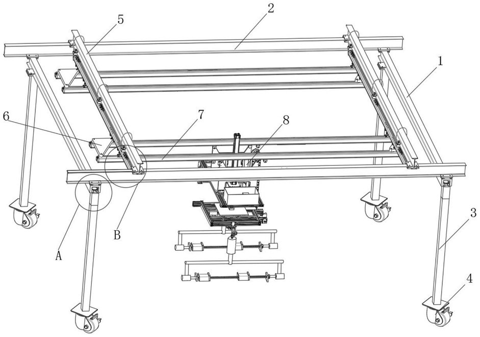 (15)连接到滚槽二(16)内部,且齿轮二(15)一端与滚齿二(17)连接,电机二(14)通过齿轮二(15)在滚槽二(16)中与下挂台(6)和移载盘(8)均呈活动连接。5.根据权利要求1所述的一种轨道交通电缆用智能放线设备,其特征在于,两个立撑板(19)上方的齿轮三(26)分别连接到两个侧套框二(7)的滚槽三(27)中,且齿轮三(26)一端与滚齿三(28)连接,电机三(20)通过齿轮三(26)在滚槽三(27)与移载盘(8)呈活动连接。6.根据权利要求1所述的一种轨道交通电缆用智能放线设备,其特征在于,所述侧套框三(24)上设置有中空的与齿轮四(41)相适配的滚槽四(40),且齿轮四(41)连接到滚槽四(40)中,电机五(29)通过齿轮四(41)在滚槽四(40)中与放线架(25)呈活动连接。7.根据权利要求1所述的一种轨道交通电缆用智能放线设备,其特征在于,所述绕线轴(37)贯穿套轴孔(43),且齿轮五(44)连接到绕线轴(37)中,齿轮五(44)一端与滚齿四(39)连接,电机七(42)通过齿轮五(44)在绕线轴(37)上与夹挡块(38)呈活动连接。8.根据权利要求1所述的一种轨道交通电缆用智能放线设备,其特征在于,所述电动轮(4)上设置有电机八,电机八与电动轮(4)转动连接。9.根据权利要求1所述的一种轨道交通电缆用智能放线设备,其特征在于,该设备的使用方法具体包括以下步骤:步骤一:电缆被绕接在移载盘(8)两侧的绕线轴(37)上,当需要进行放线时,立支杆(3)顶部的电机一(9)通过齿轮一(11)在滚槽一(10)中配合滚齿一(12)滚动,来调节该设备两侧的立支杆(3)之间的间距,从而将电动轮(4)布置在不同宽度轨道两侧的轨板上;步骤二:下挂台(6)上方的夹连座(13)通过电机二(14)带动齿轮二(15)在底框(501)的滚槽二(16)中配合滚齿二(17)滚动,来带动顶载框(5)和移载盘(8)前后调节活动,来改变该设备的放线工作位置,且移载盘(8)上的电机三(20)通过齿轮三(26)在侧套框二(7)的滚槽三(27)中配合滚齿三(28)滚动,来带动移载盘(8)左右调节进行放线的位置,并且配合移载盘(8)上的电机四(21)通过传动轴一(22)带动转板(23)和放线架(25)旋转调节进行放线的位置;步骤三:放线架(25)顶部一端的电机五(29)通过齿轮四(41)在滚槽四(40)中滚动,来带动放线架(25)调节活动,并且放线架(25)上的液压油缸(31)通过液压杆(32)带动连撑杆(33)和绕线轴(37)上下调节活动,电机六(34)通过传动轴二(35)带动绕线轴(37)转动,对电缆进行放线工作。