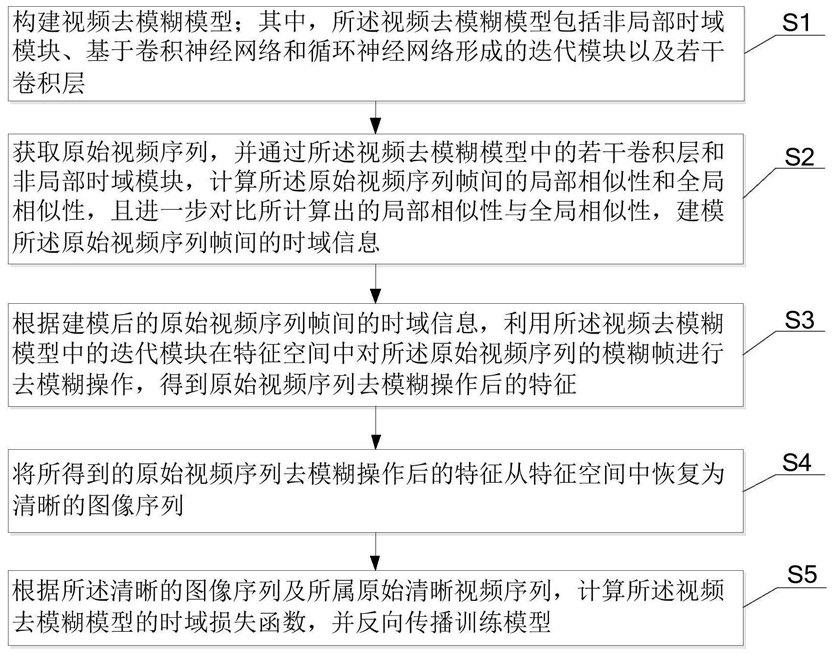 步骤S2、获取原始视频序列,并通过所述视频去模糊模型中的若干卷积层和非局部时域模块,计算所述原始视频序列帧间的局部相似性和全局相似性,且进一步对比所计算出的局部相似性与全局相似性,建模所述原始视频序列帧间的时域信息;
