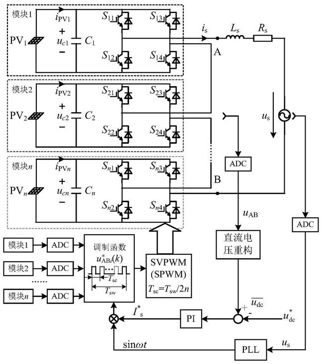 步骤5:按照从1到n的顺序求得各H桥在第k个刷新周期对应的最优调制函数其中第i个H桥在第k个刷新周期Ts对应的调制函数 的计算公式为:其中,Ls为网侧电感值;R为网侧线路电阻与电感寄生电阻等效值;is(k)为逆变器输出电流采样值, 为逆变器输出电流参考值,us(k)为网侧电压采样值,λ为直流侧电容电压平衡权重系数;Ci为第i个H桥直流侧电容的电容值, 为H桥直流侧电压参考值,为H桥直流侧电压重构值,iPVi(k)为第i个光伏组件输出电流采样值,1