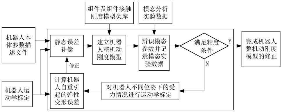 7.根据权利要求5所述的切削加工机器人静态误差补偿与动刚度模型的修正方法,其特征在于,通过模态综合理论将动刚度子模型综合为机器人的整机动刚度理论模型,这一过程包括:对机器人中影响误差分析的组件及组件接触特性进行模态实验,通过对激励、响应数据的采集与处理,建立组件及组件接触特性的动刚度实验子模型与模态子模型,辨识出模态参数并进行动刚度实验子模型的验证;