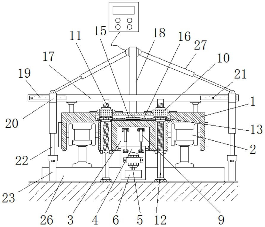 于此同时在控制面板的作用下控制第三液压杆(27)的伸缩运动,在第三液压杆(27)伸缩时,带着套筒(20)在滑槽(19)上滑动,在套筒(20)内部的光电传感器(21)与滑槽(19)内部的光电传感器(21)相互接触时,光电传感器(21)通过单片机传输信号,在设备的内部电路板的数据反馈作用下使得第二液压杆(25)延伸,通过第二液压杆(25)的延伸改变夹臂(23)的位置,利用夹臂(23)和锯齿夹持铁片(24)夹紧轨枕本体(26),随着第三液压杆(27)的延伸,套筒(20)通过连接杆(22)和夹臂(23)给予轨枕本体(26)轴向移动力;