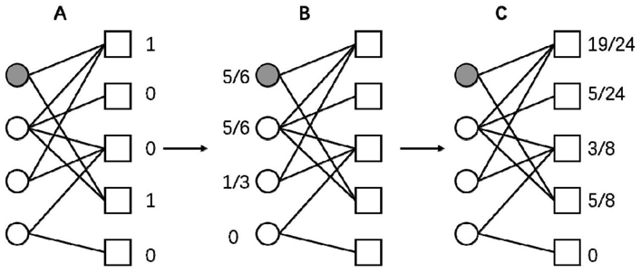 其中,fa 为用户i对事物α所拥有的资源量,当用户i与事物α之间存在边时,那么用户i对事物α所拥有的资源量表示为1,否则为0,即aiα=1 or aiα=0;
