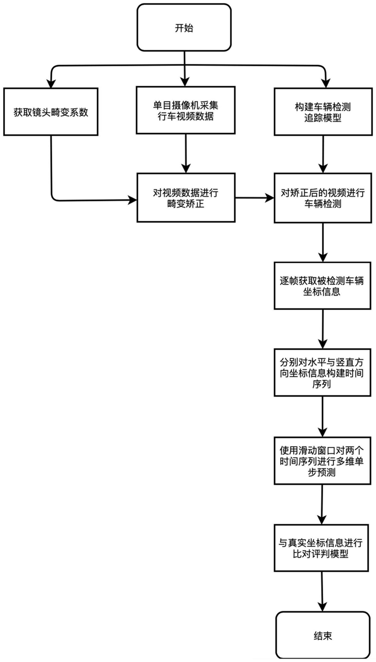 S4,使用S22得到的摄像头内参数矩阵与畸变系数对S1所得视频数据进行逐帧的畸变矫正,得到一系列矫正后的图像,并使用S3得到的端到端车辆检测追踪模型对得到的矫正后的图像进行车辆边框检测,得到每一帧的车辆边框坐标信息;