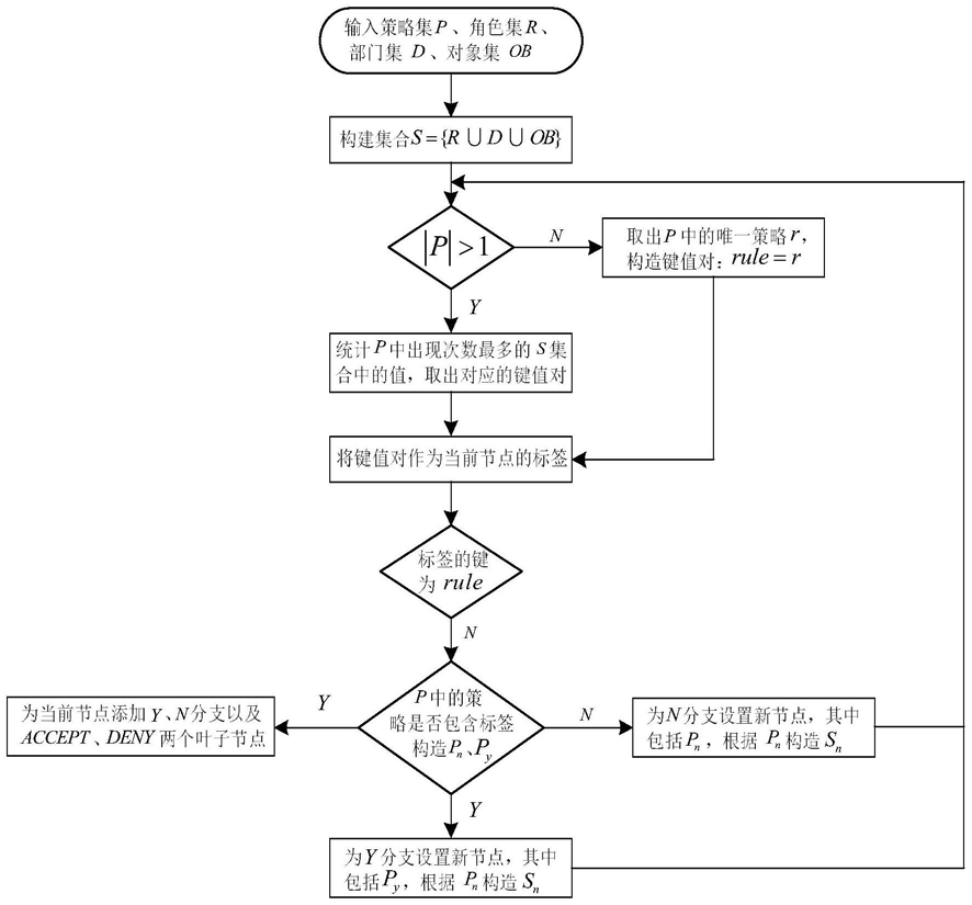步骤(4-3).重复步骤(4-2),直到当前分支下连的节点标签的键为rule时,将集合S中的值以及节点标签所对应的规则ri中op条件的值与访问请求相匹配,任意一项不匹配就向下进入分支N,否则向下进入分支Y;返回当前分支对应叶子节点的标签,即返回匹配结果,ACCEPT标签代表接受,DENY标签表示拒绝。